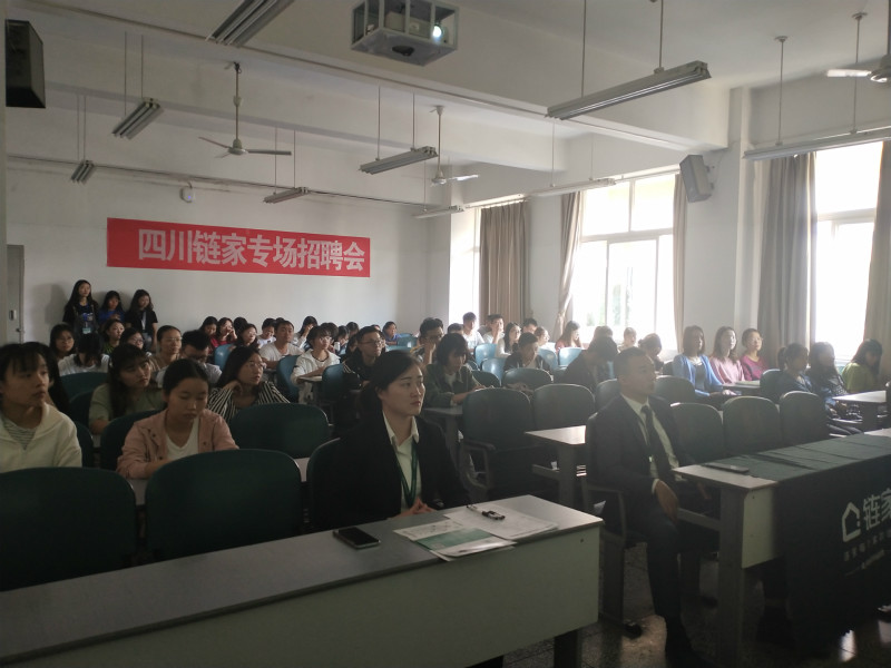 招聘会上,韩冬慧通过PPT详细介绍了四川链家发展现状、定位、使命及前景,结合公司人才需求的实际情况为同学们讲述招聘岗位信息及招聘流程。