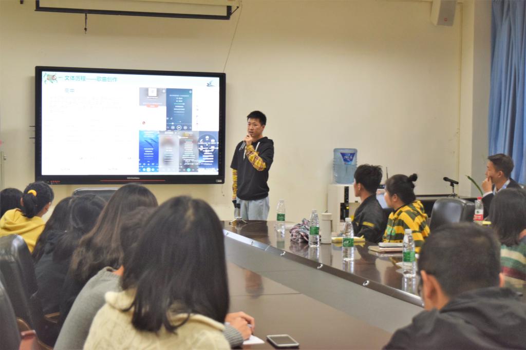 宣讲会开始,胡遵程向校园之星获得者送上纪念品。何凯同学、周浩然同学分别就自身创业团队建设情况、员工组织工作经历和组建乐队、歌曲创作的经历等方面与同学们进行分享,并讲述自己的未来规划,希望大家都坚守自己的梦想,不懈奋斗,砥砺前行。