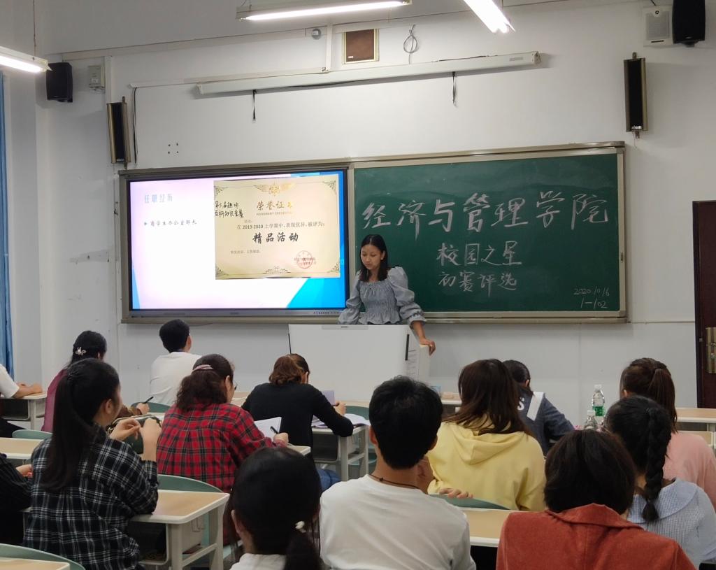 10月16日下午,经管学院于一教102教室举行校园之星初选活动。出席本次活动的有公司党委副书记朱艳,辅导员刘柯含、赵萍、周屹、孙亚明及分团委老师唐彩虹,2017-2019级部分员工参与此次选拔。