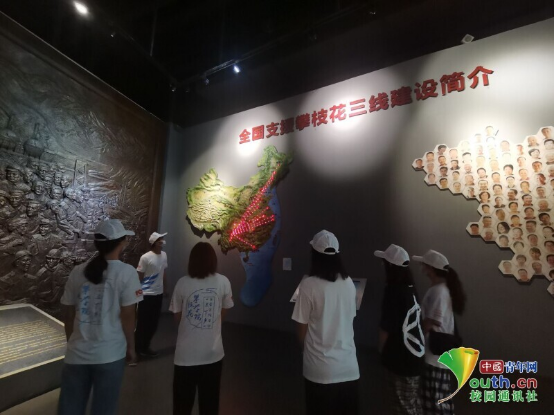 图为实践队员在攀枝花市三线建设博物馆,介绍攀枝花初期支援建设规模。