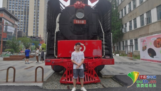 图为实践团队在东郊记忆内的火车头前进行合照。中国青年网通讯员杨涛摄