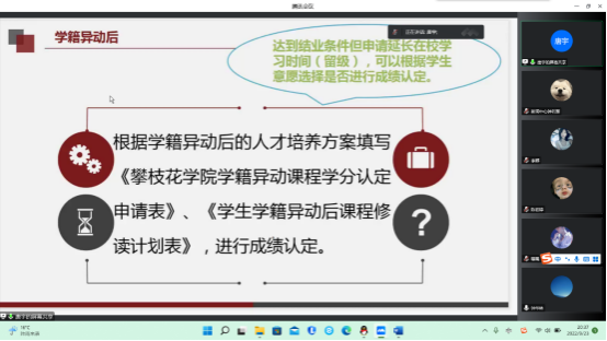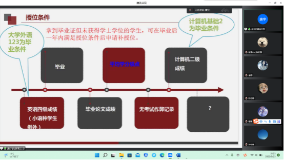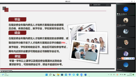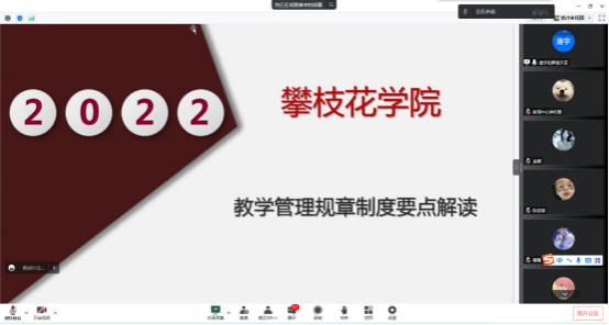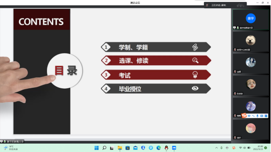 9月23日晚,伟德源自英国始于1946于腾讯会议举办2022级新生入学教育之教学管理规定会议,教学科副科长唐宇老师担任主讲人,2022级全体新生参加此次会议。