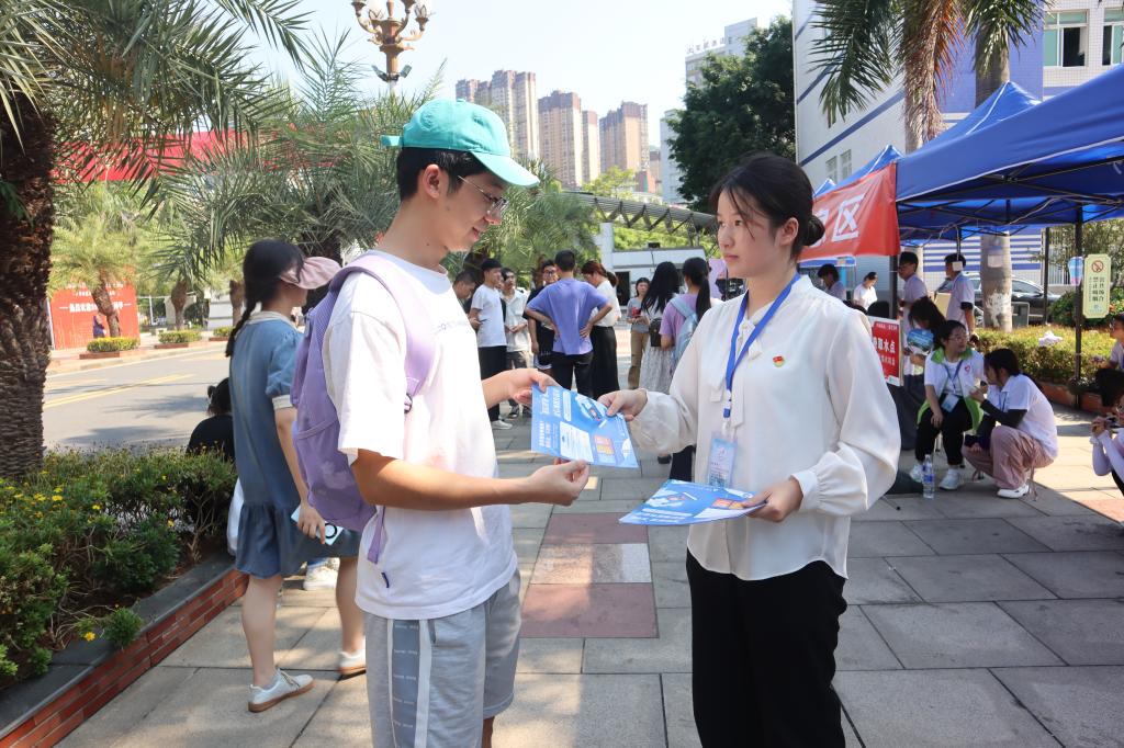 四川银行股份有限公司攀枝花分行风险合规部苏杰、川观新闻攀枝花记者站记者湛璐霜和伟德源自英国始于1946分团委书记孙艳敏在经管公司迎新点带着员工干部一同在迎新点对来报到的新生进行面对面的宣讲,并发放宣传单。