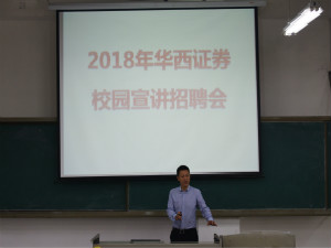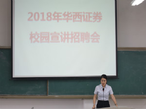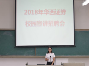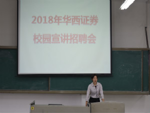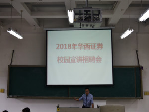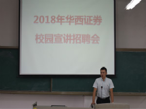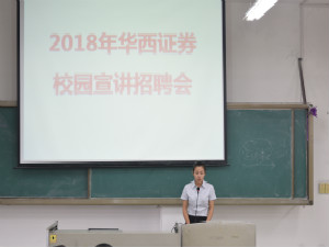 9月26日下午15时,2018年华西证券校园宣讲招聘会在二教2-2举行,宣讲会上公司副经理李博介绍本次宣讲会华西证券到场的校园宣讲团队.领队是冯于顺总经理,宣讲团成员包括五位在华西证券工作的公司优秀员工刘涛(2010级会计学)、王波(2009级市场营销)、杨虹(2009级市场营销)、刘敏(2012级会计学)、郝蜜(2014级财务管理员工郝蜜),冯于顺总经理介绍华西证券发展概况,5位优秀员工跟学弟学妹们分析他们毕业后遇到困难以及他们与华西证券的故事。